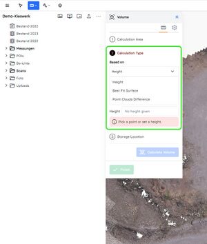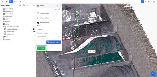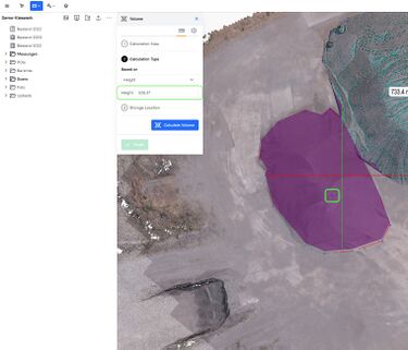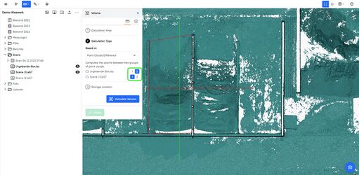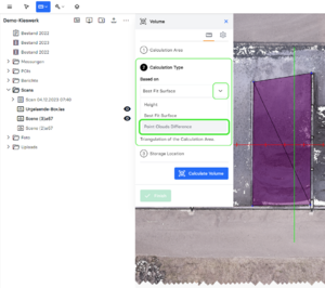 This tool is designed for comparing or calculating changes relative to a previous state. For example, in a construction site excavation, you can use either the topology point cloud provided by the state or a scan taken prior to the excavation. With the Point Clouds Difference Volume Measurement tool, you can calculate the amount of material excavated. Please note: This tool requires a minimum of 2 point clouds.