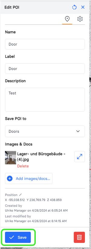 - Select the POI you wish to relocate in the model by holding down the left mouse button for two seconds (it works best if you click on the text/photo of the POI instead of the point)