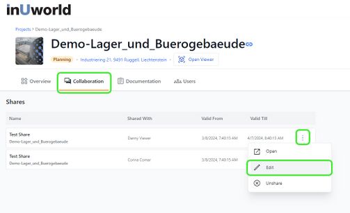 For project-related shares, access them through the "Collaboration" button in the project overview. You can view all shared scenes, whether shared by you or with you, via the "Shares" button.