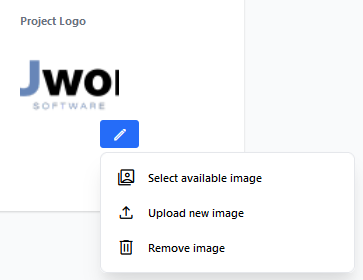 Click on the pencil next to the Project logo Upload a new image or choose select available image. When choosing upload a new image, select the desired image in the explorer and press the open button. When choosing select available image, all photos already uploaded in the project are displayed. Select the desired photo and press the Confirm button